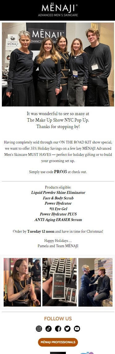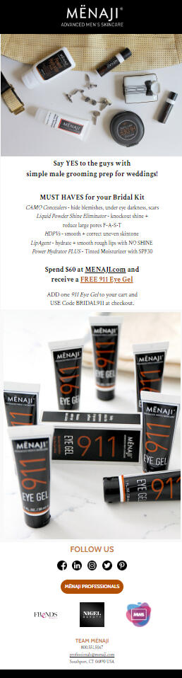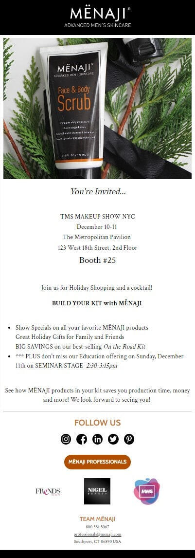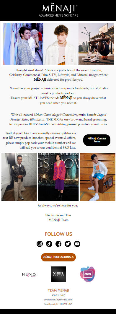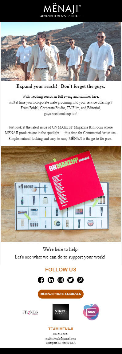 I had the pleasure to work with the president at MËNAJI to create multiple email campaigns, delivered to beginner home-groomers to professional makeup artists (MUAs) around the globe.MËNAJI has been in business for over a decade, and they continue to inspire pros to use their best products within each opportunity.